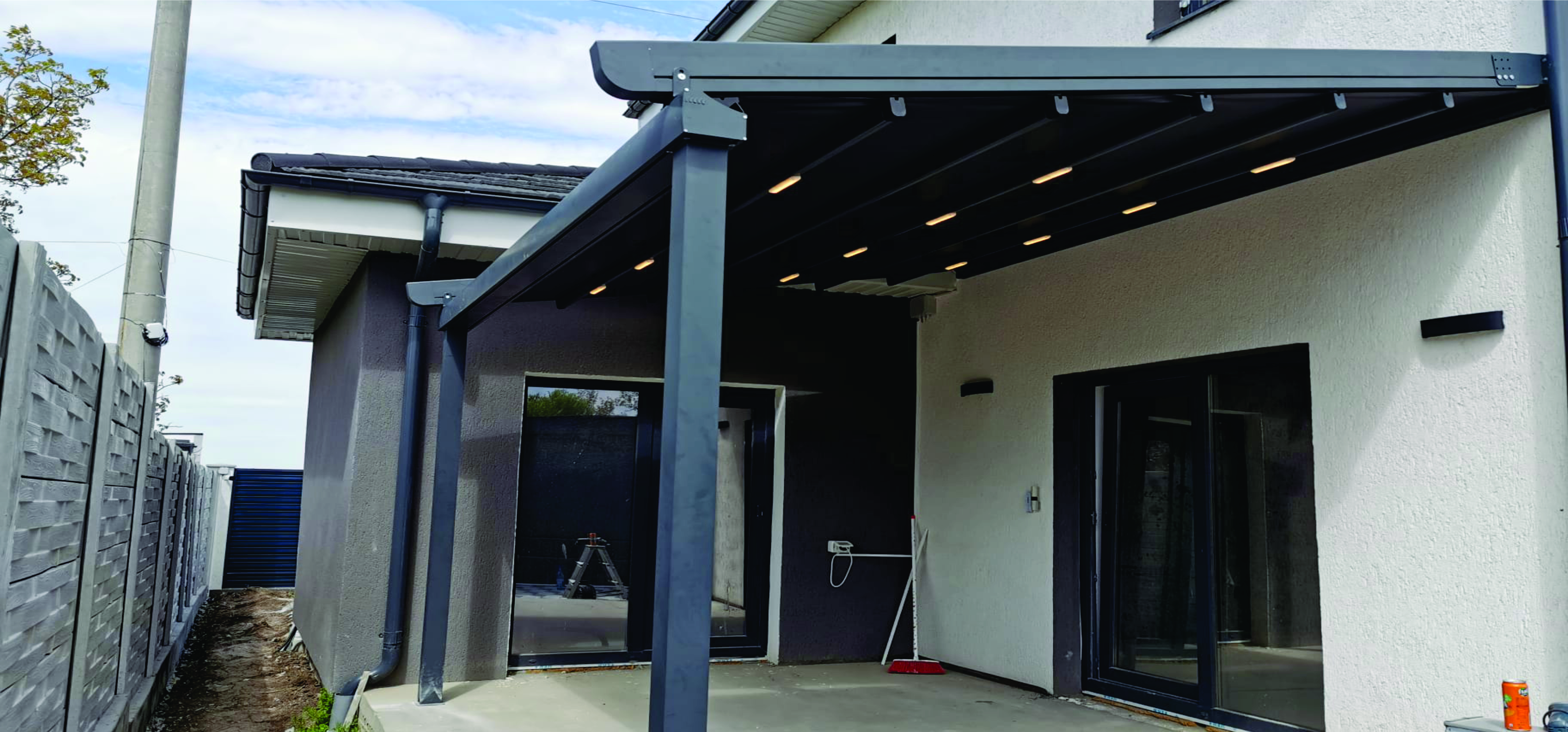 Sistem de pergola cu montaj clasic de perete sau tavan iar in fata sistem de jgheab si stalpi.